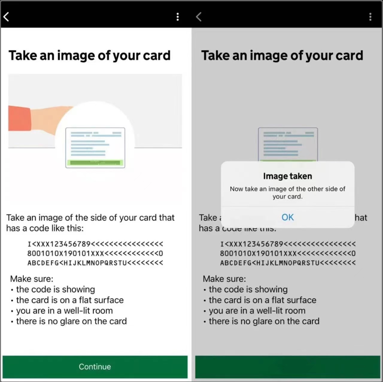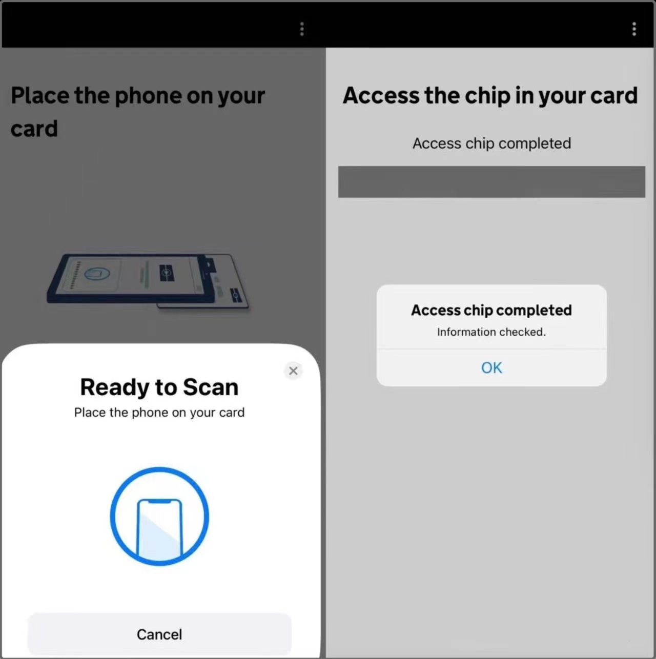 7、用手机扫描BRP卡芯片:将手机壳取下,手机背面面对着BRP卡正面左上角的小相机附近扫,芯片就在那附近,可以缓慢在那个区域移动,一旦APP上出现绿色的进度条,立刻停止移动,将手机完全贴在BRP卡上,让进度条加载完毕就是扫描成功了!