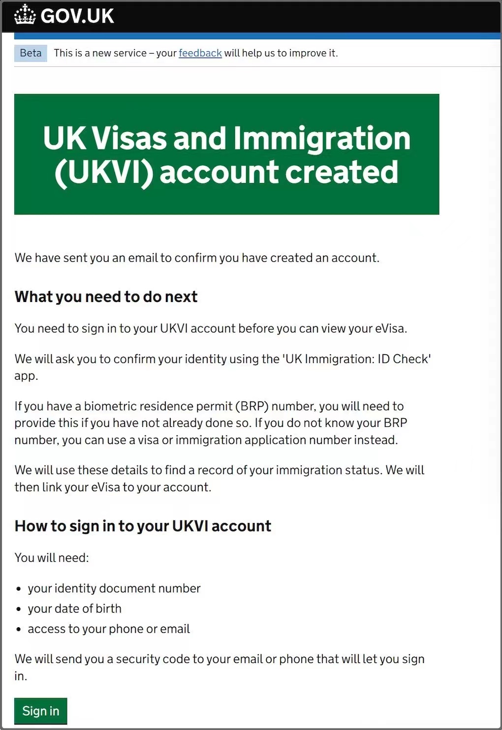 15、确认个人信息无误后,英国UKVI账户即可创建,通过BRP卡号、出生日期及邮箱或手机验证码进行登录